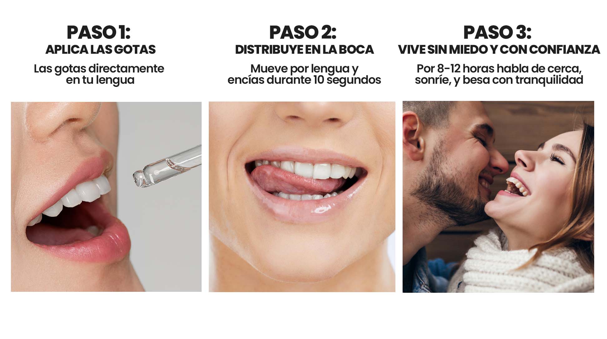 | Comodidad | ✓ 3 gotas discretas | ✗ Enjuague visible | ✗ Masticar constante | ✗ Rociar repetido |