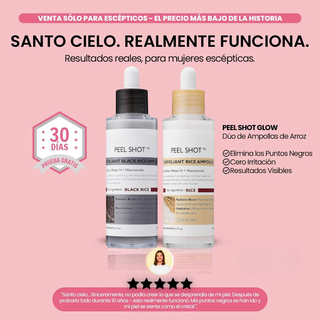 Peel Shot® fue formulado especialmente para pieles sensibles, maduras y apagadas. Es ideal para mujeres 30+ que buscan exfoliar sin irritar y recuperar su brillo natural sin químicos agresivos.